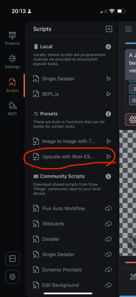 選択したら、Scripts をタップします、すると Scripts の中にそのアップスケーラーを用いてアップスケールする Presets が準備されます。さっきまでなかった Upscale with Real-ES…があると思うので、その隣の▷アイコンをタップもしくはクリックします。