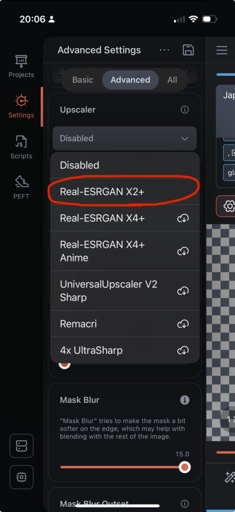 アップスケーラーを使うためには、アップスケーラーのモデルをダウンロードする必要があるのですが、Settings の Advanced の所にある、Upscaler のプルダウンメニューから、今回は Real-ESRGAN X2+ を選択してダウンロードして下さい。